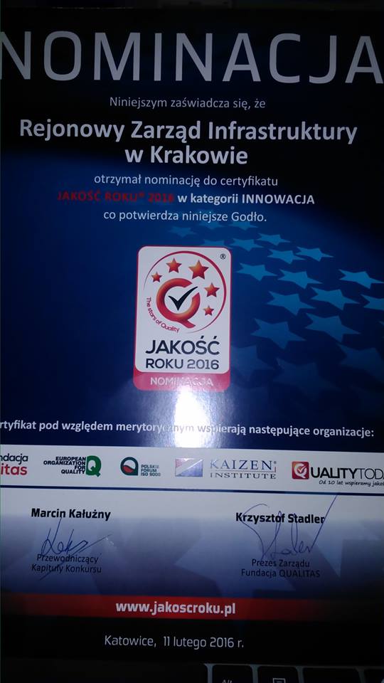 Rejonowy Zarząd Infrastruktury w Krakowie otrzymał nominację do tytułu JAKOŚĆ ROKU 2016