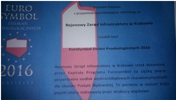 23.11.2016 – Decyzją Kapituły Programu Symbol Rejonowy Zarząd Infrastruktury w Krakowie uzyskał tytuł EuroSymbol 2016 Działań Proekologicznych – za ciężką pracę przywrócenia siedlisk wydm śródlądowych charakterystycznych dla obszaru Pustyni Błędowskiej. Dziękujemy wszystkim za wkład i zaangażowanie w realizację projektu. To wielki zaszczyt być dostrzeżonym i wyróżnionym w działaniach, które służą społeczeństwu, przyrodzie i wojsku.